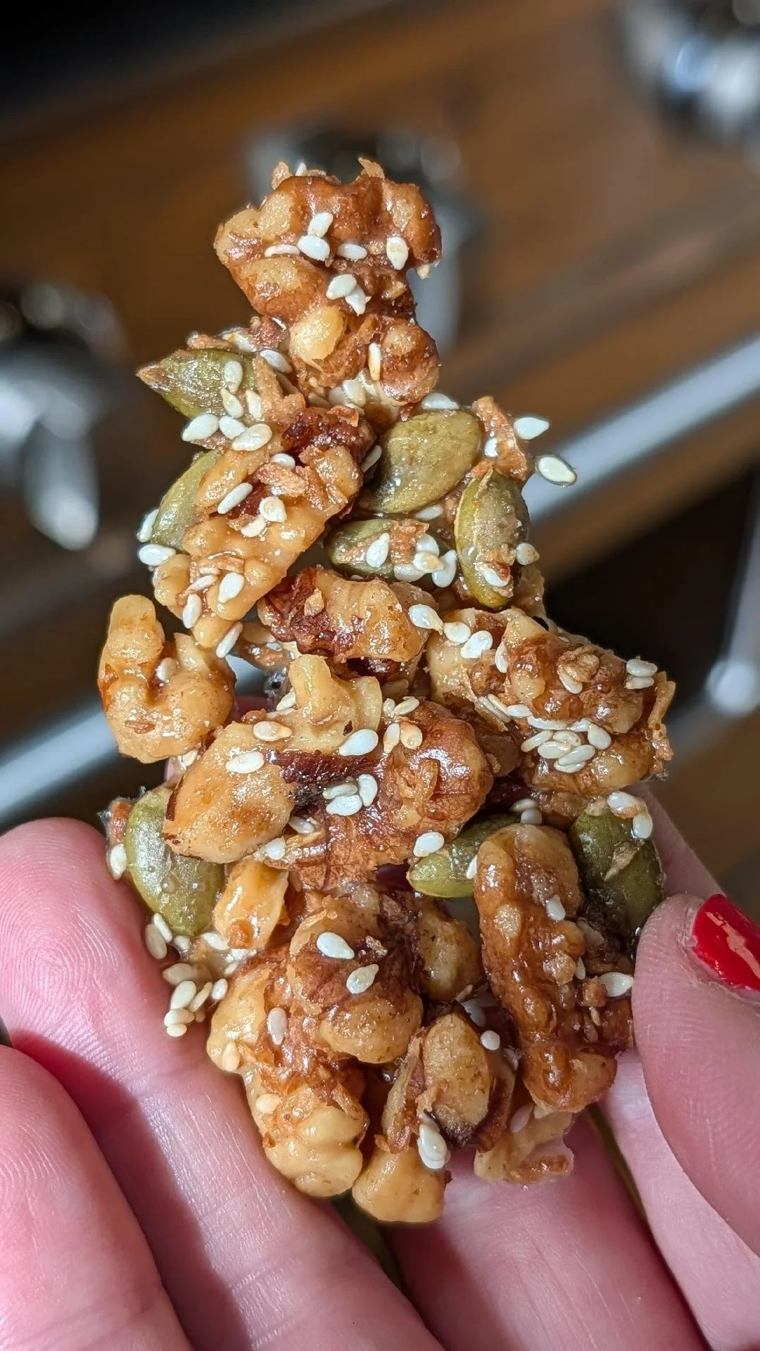 Bake for 15 minutes, then stir well. Return to the oven and continue baking in 5–10 minute intervals, stirring each time, until the mix reaches your desired level of toastiness. You’ll know it’s ready when the nuts are golden, fragrant, and lightly crisp. The kitchen will tell you before the timer does